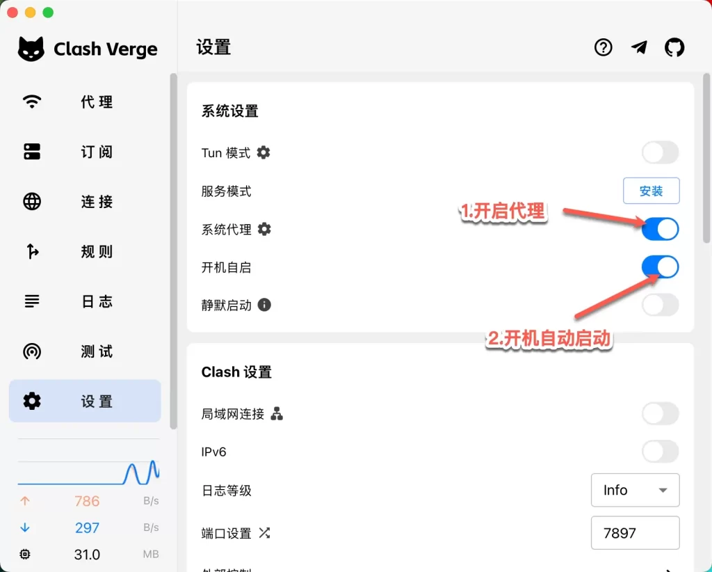 4. 在软件设置界面,开启系统代理按钮,接下来就可以访问Google了。另外我们还可以设置下开机启动方便我们重启电脑后使用。