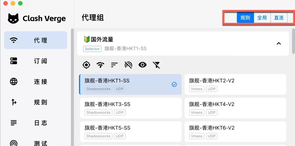 在软件的代理页面上我们可以切换代理的模式,模式主要包括规则、全局、直连。